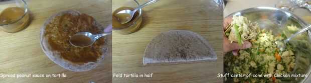 Extender salsa de maní en un lado de la tortilla caliente. Doblar por la mitad, enrollar en forma de cono y rellenar con la mezcla de pollo.