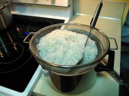 Ejecutar los fideos en agua fría hasta que estén un poco demasiado caliente para manejar. Déjelos enfriar en el colador, separa con los dedos de vez en cuando para que seque a una consistencia pegajosa.