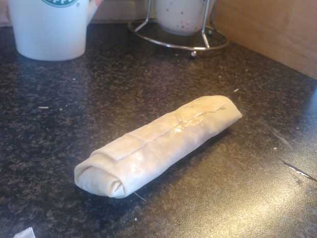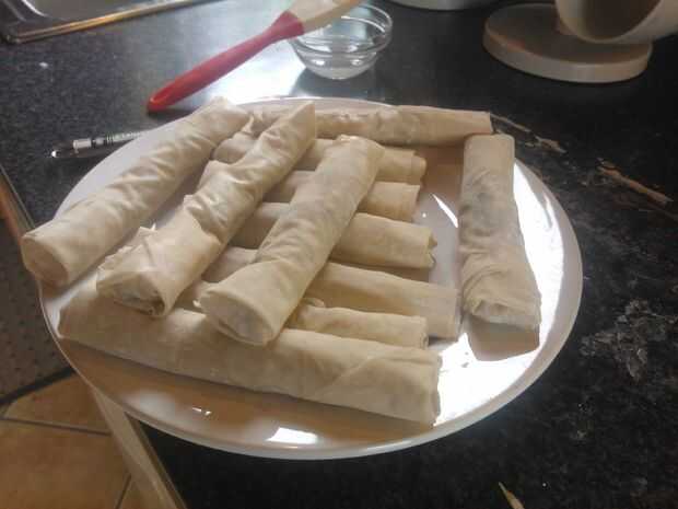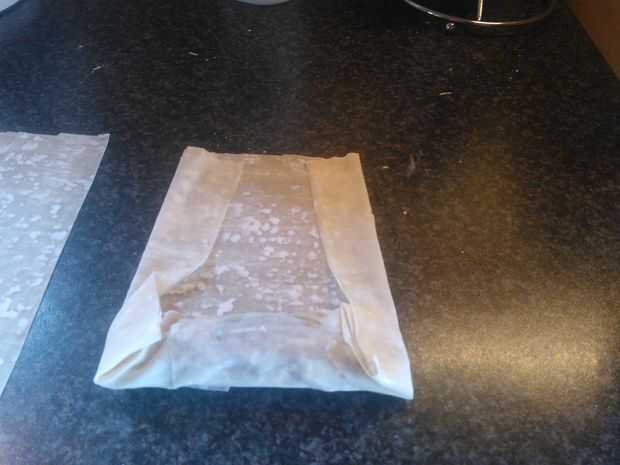 Como se puede ver en las fotos girar los dos lados y mojar la parte superior de la hoja con una brocha de cocina y agua para hacer un buen sello.