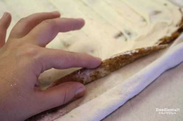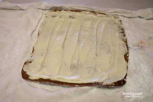 Desenrolle el bizcocho, luego extender el glaseado de queso crema por todo el pastel.