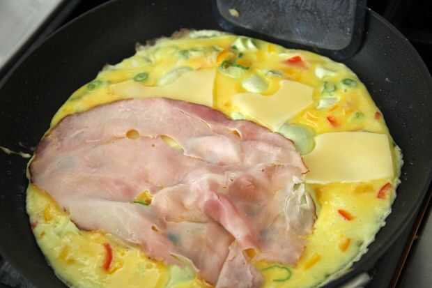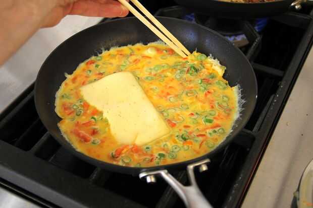 Limpiar el aceite de oliva con un pincel o una towl de papel. Vierta aproximadamente 1/6 de la mezcla de huevo en la sartén. Básicamente, vas a cubrir la sartén con una fina capa de huevo. Si desea agregar jamón o salmón o lo que sea, en este primer rollo y asegurarse de que todo lo que usted está añadiendo es fina o picada! Una vez que el huevo comienza a fijar, con palillos o una espátula de goma (sinceramente, a veces es mejor utilizar ambos juntos), comenzar a rodar el borde más alejado de usted hacia usted. Hacerlo lentamente y trate de mantener cilíndrico si se puede, pero pasa nada si llega a ser más como una forma de ladrillo. Quieres ir despacio porque no quiere romper la tortilla.