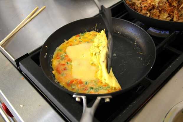 Una vez que han enrollado la tortilla, empuje hacia atrás para el borde más lejano de la cacerola. Salir el towl de aceite de oliva y aplicar otra capa fina de aceite de oliva. Vierta aproximadamente la misma cantidad de mezcla de huevo vertida última vez en la sartén. Esto es importante: su objetivo es levantar con cuidado la tortilla así que la nueva mezcla de huevo se vierte por debajo la tortilla enrollada y combina con la tortilla ya cocida. Esto asegurará que su próximo tiro será transparente y uniforme. Una vez que el huevo empieza a establecer, vas a seguir rodando.