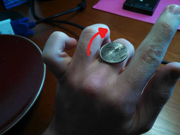 El dedo del anillo debe ser ahora en una buena posición para bajar en la esquina de la moneda, por lo que probablemente debería hacer.
