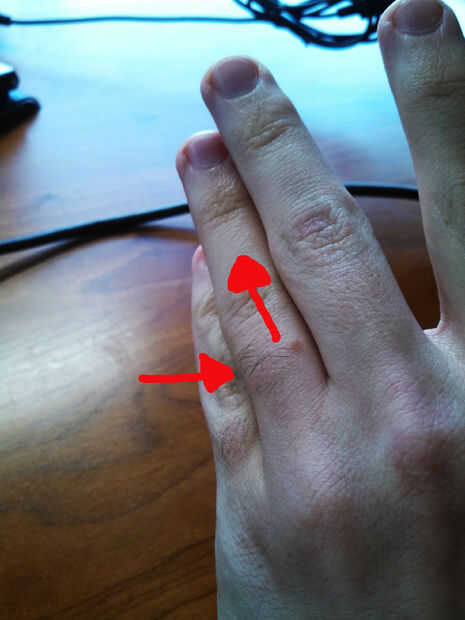 Dedo anular va para arriba, pero el pinky aprieta y se mueve en y bajo el dedo anular. Otra vez esa analogía de tijera es la mejor manera que puedo describir esto.