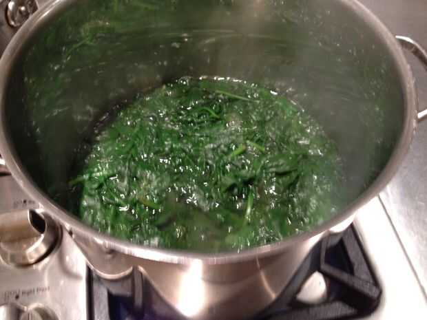 Lave las espinacas en un colador y cortar cualquier tallos restantes, colocar las espinacas en agua hirviendo durante unos cinco minutos.
