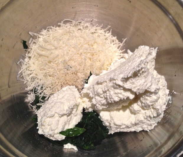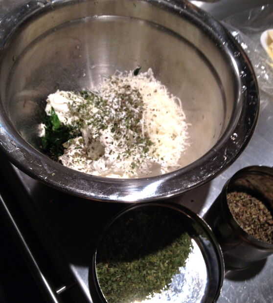 Mix together... grande en acero inoxidable mezcla Bol, la espinaca, ricotta, rallar queso, huevos, sal, pimienta, perejil y albahaca.