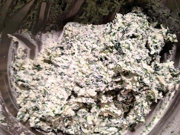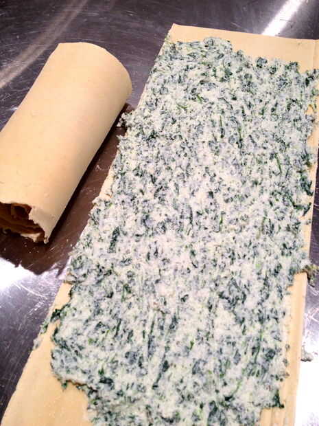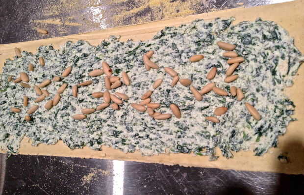 Sobre una mesada, Coloque una hoja de la pasta y la propagación del queso relleno uniformemente en toda la pasta. Tratar de llegar lo más cerca y uniformemente separados como sea posible a los bordes, asegúrese de que deje al menos un 1/4" de todos los bordes con el fin de impedir que exprimiendo al rodar. En este momento, si desea utilizar los piñones, los repartidos en el relleno.