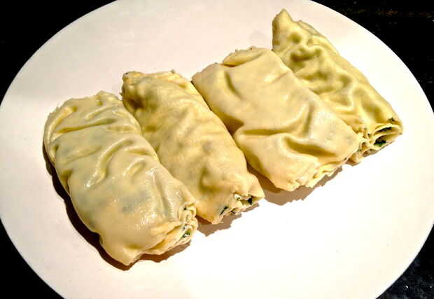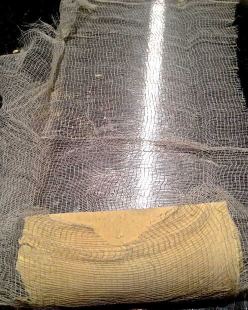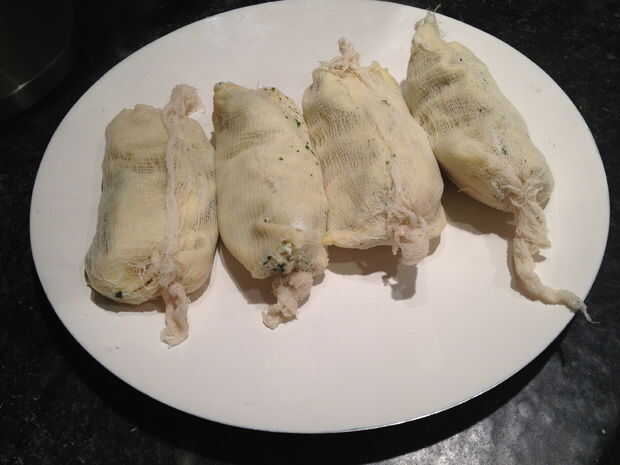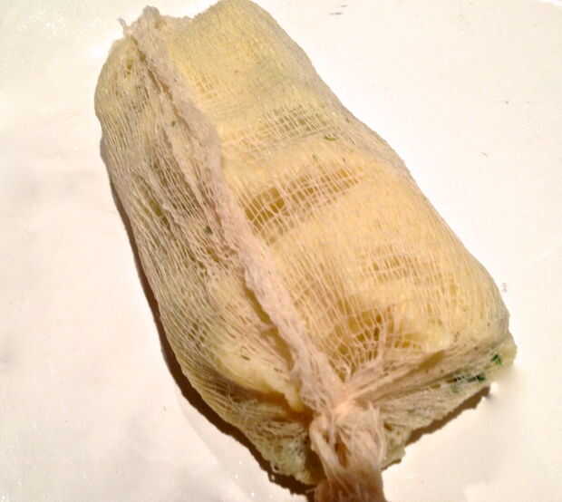 Hemos llegado los últimos pasos, tome la pasta rodada y el lugar en el centro de un trozo de tela de queso cortado, sobre un extremo de la tela de queso para cubrir la parte superior de la pasta y luego rodar el paño de queso alrededor de la pasta hasta que alcanza el final de la aleta. Atar ambos extremos de la tela con la cadena aséptica o sólo cortar los trozos de la tela de queso en trozos pequeños y utilizar para atar los extremos.