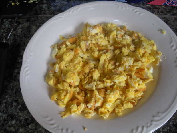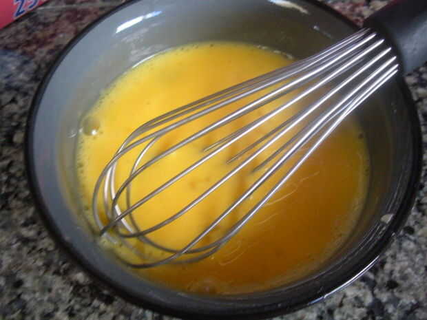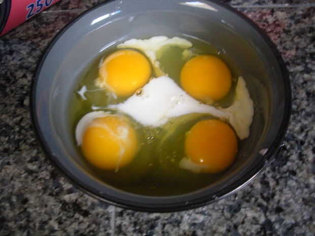 Mientras que el tocino esté en el horno los huevos necesitan cocinarse. Esta parte es simple todo lo que necesitas hacer es crack cuatro huevos abiertos, echar un chorrito de leche, batir y scramble.