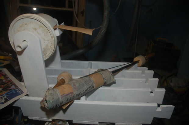 Cortar dos asas grandes, de un trozo de añejo de la fregona y usando una simple Sierra, cortar cuatro discos de una sola pieza de pino, dos con 12 mm centro de agujeros, dos con agujeros de 22 m, correspondientes al diámetro de los mangos y pegan como en las fotos. Taladré un agujero de 10mm en el centro de la derecha * pieza de mango, la fregona roscado internamente con un M12 x 1,5 hilo, luego cortar el mismo hilo en el extremo de la barra de metal. (Se puede comprar un conjunto básico de machos y cojinetes para bajo un tenner que harán frente a todo esto y muchos otros puestos de trabajo!), pero toma un poco de fuerza para iniciar y seguir el hilo, y no estoy tich! Utilizar abundante aceite y hacer solamente un cuarto de vuelta antes de invertir para limpiar la viruta. Alternativamente, sólo desbaste final y usar un pegamento de la resina de epoxy, pegamento del metal en la madera.