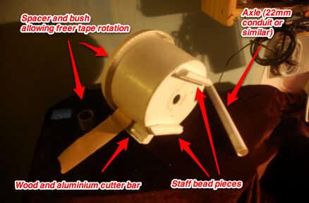 Cortar una ranura para permitir que las dos cintas pasar, (Mantenga los bordes suaves o cortará la cinta, más tarde, yo puedo afinar la ranura con algunos 'labios' o rodillos de la aguja), luego caliente pegado un pedazo de madera debajo de en frente y en esto, tan lejos de la ranura como sea posible (o te resultará muy difícil a la cinta una vez se ha cortado un pedazo del hilo de rosca. La próxima vez, voy a hacer una barra de metal que sobresale unos tres o cuatro pulgadas lejos), pongo un trozo de aluminio angular pequeña que acababa de poner cortes de sierra en y tierra luego a una hoja con mi herramienta rotatoria de modelado, y esto actuó como un cortador para ajustar la cinta hacia abajo el y cortar como un dispensador de cinta adhesiva.