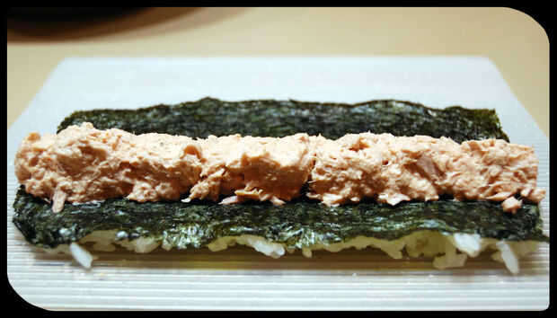Una vez que el arroz se extiende uniformemente, vuelta el nori y sobre de arroz y atún picante a lo largo de la tercera parte de la nori más cercana a usted. En este punto Agregar cebolla frita del francés, puede omitirlos o añadir las zanahorias, apio o cualquier otra cosa que te gusta. Sólo asegúrese de mantener a lo largo de la parte inferior tercera del nori.