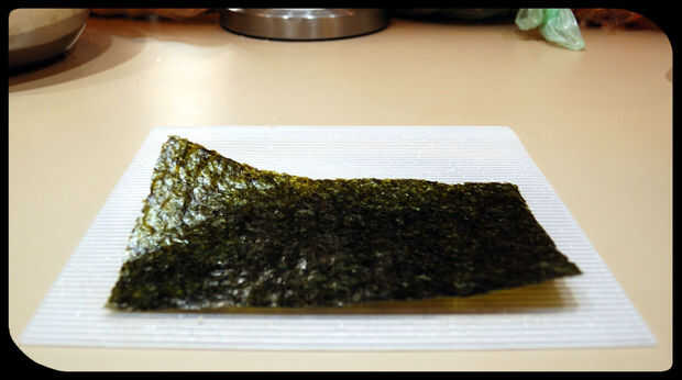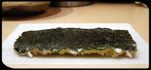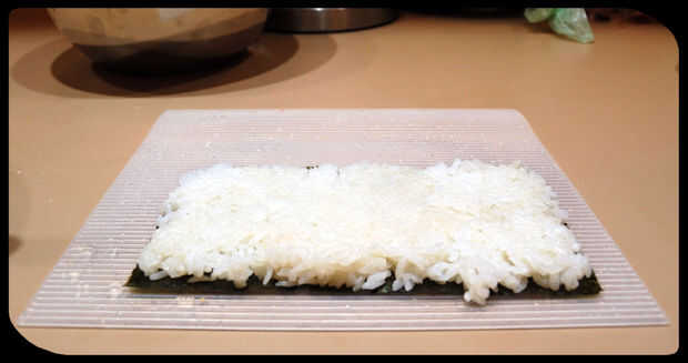 Cortar las hojas de nori por la mitad y usando un medio, coloque sobre el tapete a lo largo de la orilla más cercana a usted, el lado brillante hacia arriba. Usando una bola de arroz de sushi sobre el tamaño de un béisbol y pat plana sobre el nori, usando sus dedos. No necesita dejar ningún margen alrededor de los bordes.