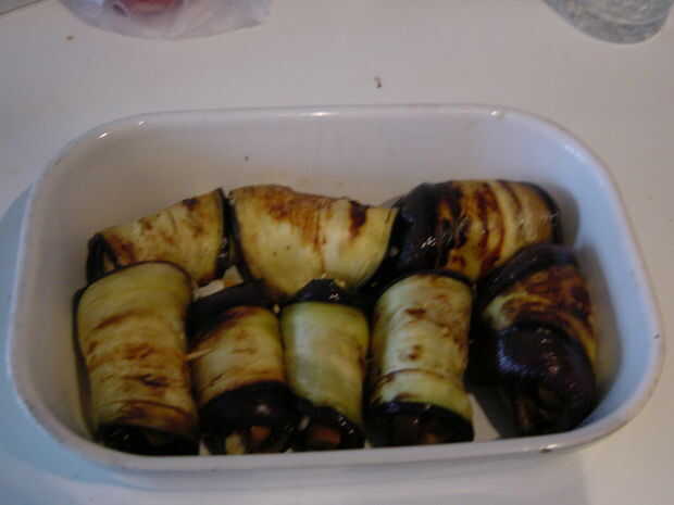 • enrollar la rebanada de berenjena bien alrededor del relleno y de lugar en una cazuela con la abertura hacia abajo. ¡ Asegure los rollos con un palillo de dientes, recuerde cuando se come más tarde!
