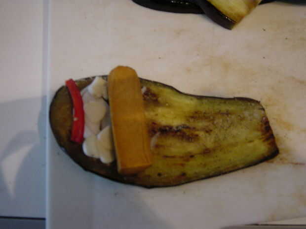 • Coloque saussage, peperoni, cebolla y ajo en un extremo de la loncha de berenjena. Añadir una pizca de pimienta negra y hierbas a gusto
