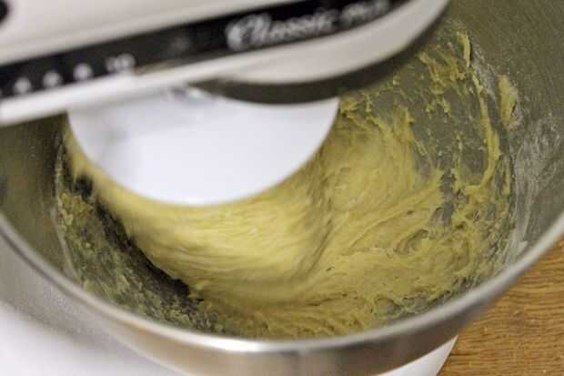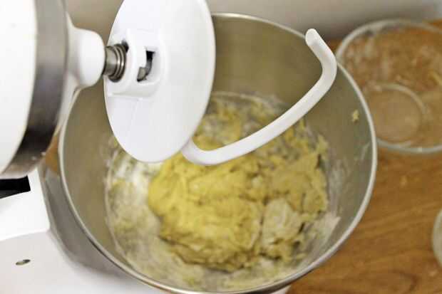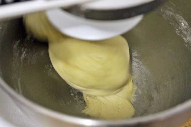 Vuelva a encender su mezclador y espolvorea lentamente la harina en la masa hasta que confluye y no se pega demasiado en el tazón de fuente (como se muestra en la imagen).