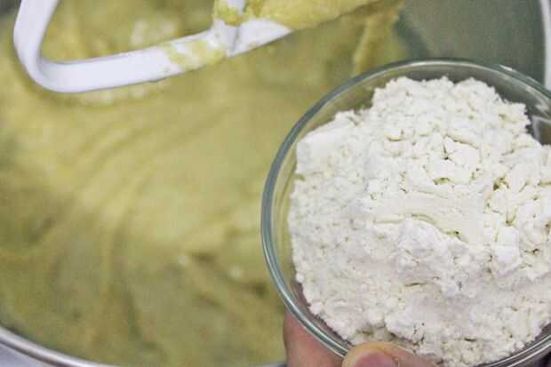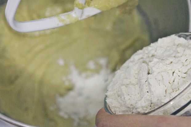 Añadir la mitad de la harina extra a su masa, mezcla en baja hasta sólo combinar.