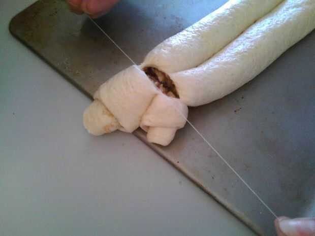 Yo siempre uso este método cuando corte masa. Cada vez que lo intento con un cuchillo, hace un lío. Uso de hilo, hace un corte muy limpio.