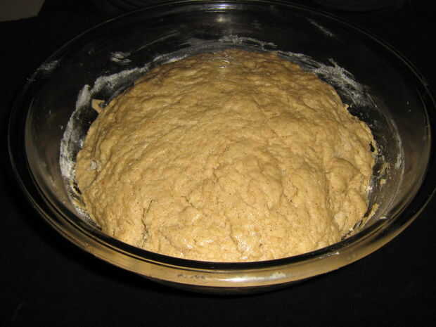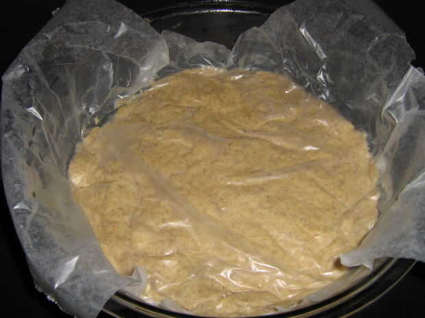 Coloque un paño de cocina sobre la envoltura de plástico papel encerado engrasado y deje reposar hasta que doble - aprox. 2-3 horas.