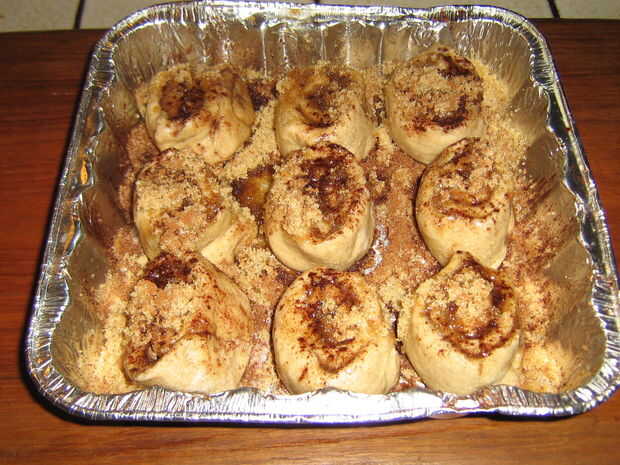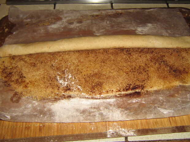 Cepille la parte superior con la mantequilla derretida y extender uniformemente el azúcar morena y la canela (pedazos de nuez, pasas). Cubra con envoltura de plástico papel encerado engrasado y deje reposar durante 2-3 horas.