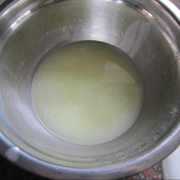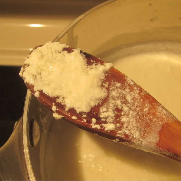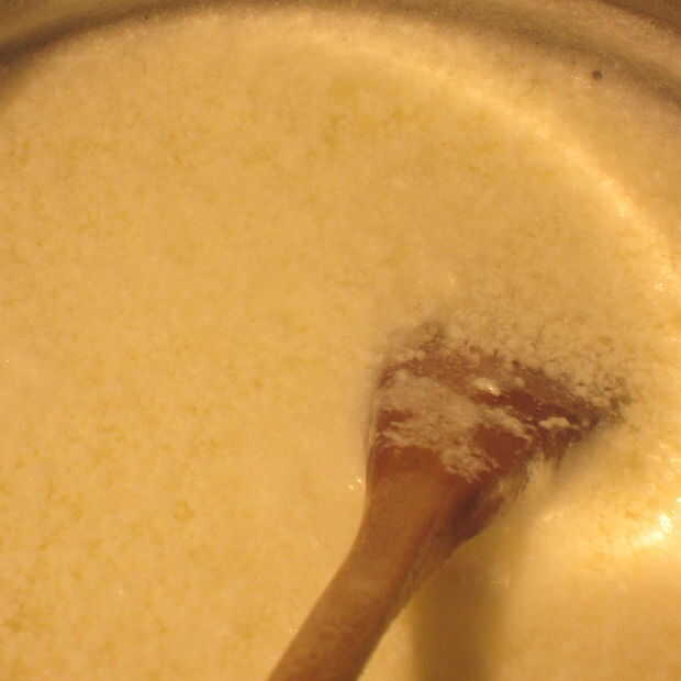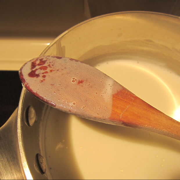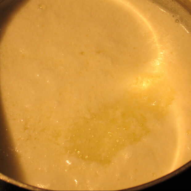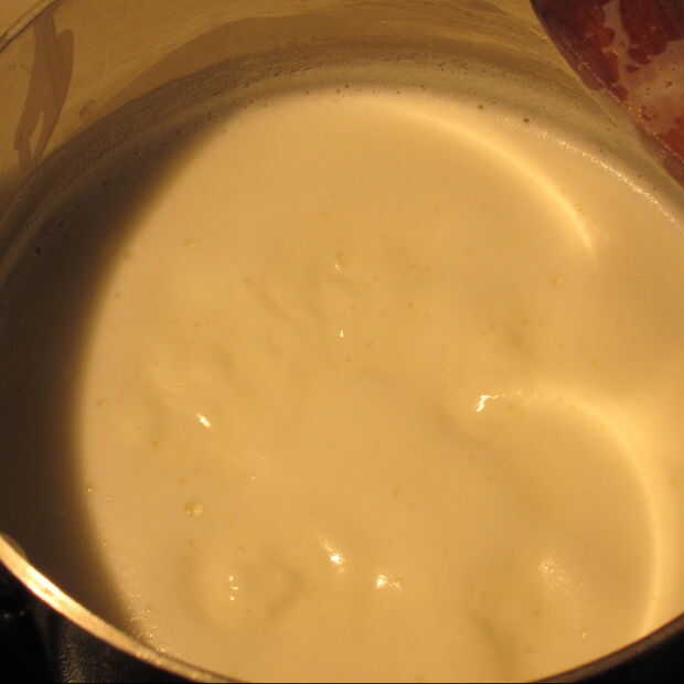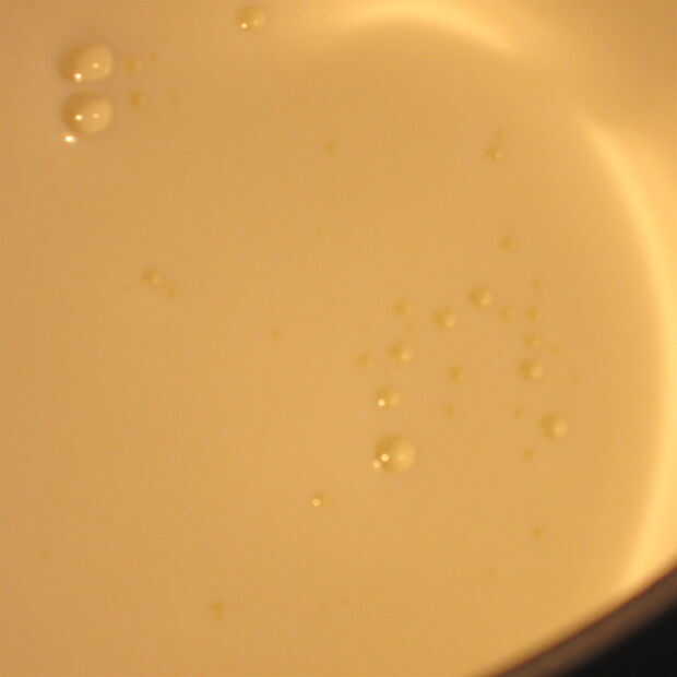 (Una vez que la mezcla esté a punto de hervir se iniciará a ver pequeños glóbulos de grasa a la superficie).