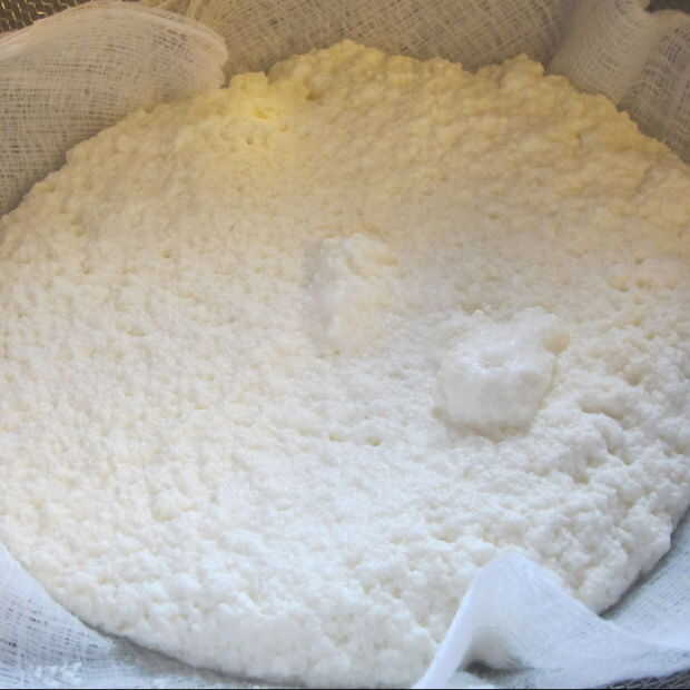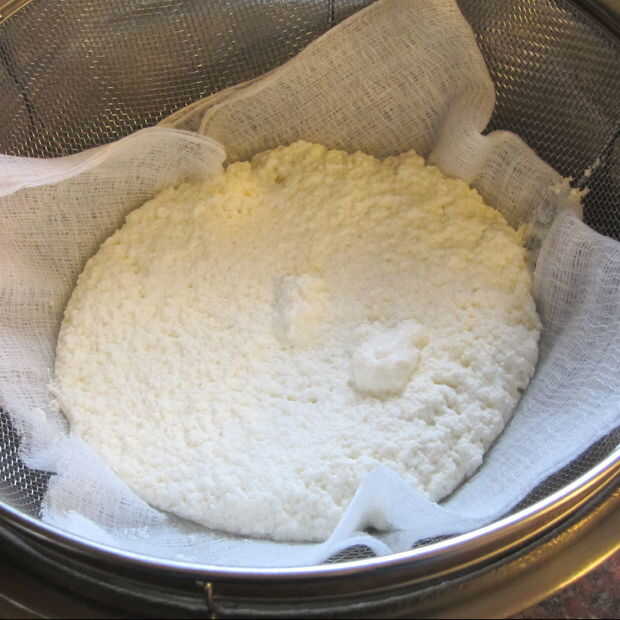Cuando la mezcla comience a hervir reducir el fuego a medio bajo, añadir el vinagre y revuelva. Inmediatamente se cuaje la mezcla. Deje que hierva a fuego lento durante unos dos minutos y colar por estameña. Voila, usted acaba de hacer ricotta! Le dije que era fácil!