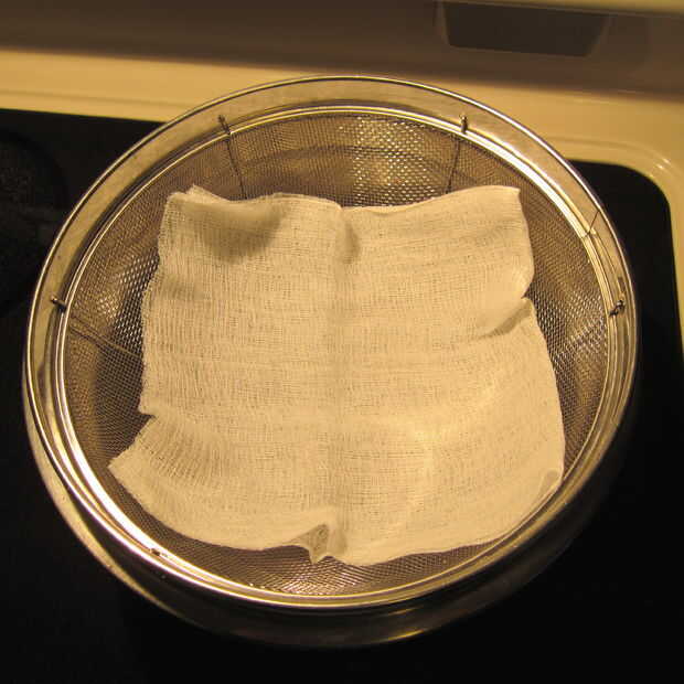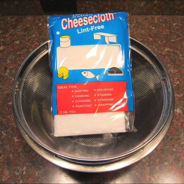 Capa de dos o tres pedazos de gasa sobre un colador y coloque el colador en el recipiente grande. Ponga a un lado.