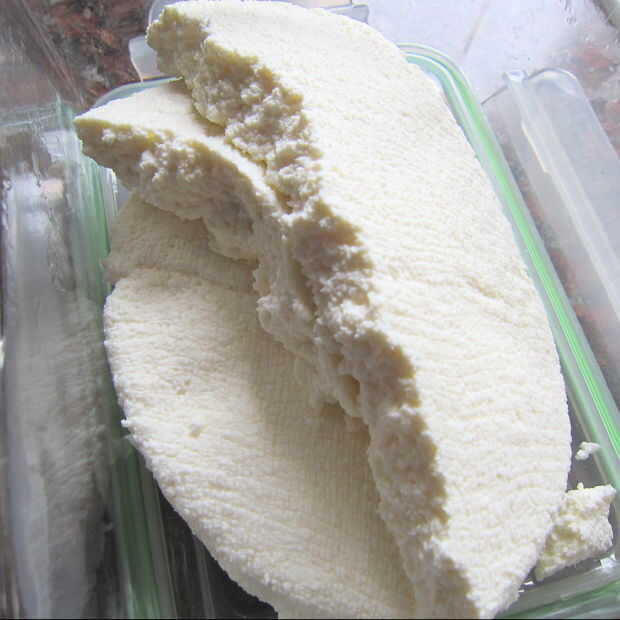Deje que la ricotta se enfríe. Cuando usted levanta el colador encima y fuera de la vasija de vaciado, verá suero. Esto no verter por el desagüe, se utilizará en el siguiente paso! Suero de leche es ideal para cualquier masa de pan.