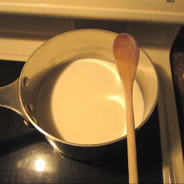 En una salsa de mediana sobre fuego medio alto, agregar leche, crema y sal. Poner a hervir revolviendo con frecuencia para evitar el chamusqueo.