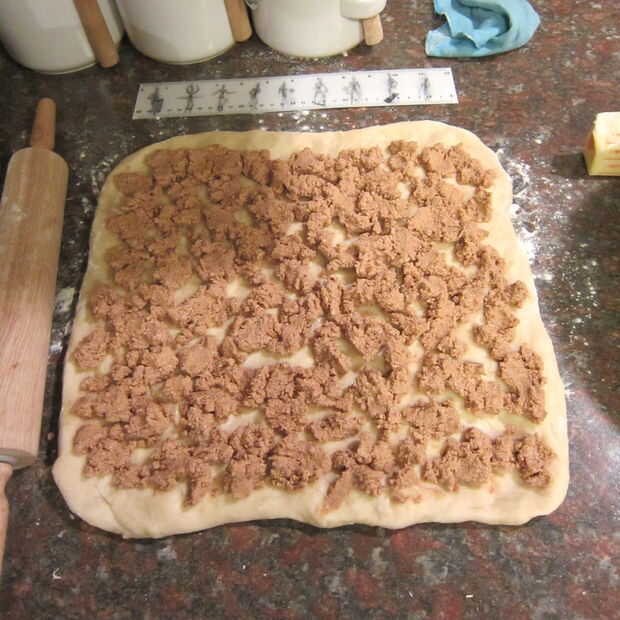 En una capa uniforme, extienda el relleno sobre la masa dejando un espacio de 1 pulgada en uno de los extremos.