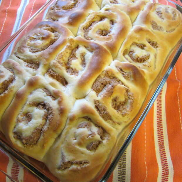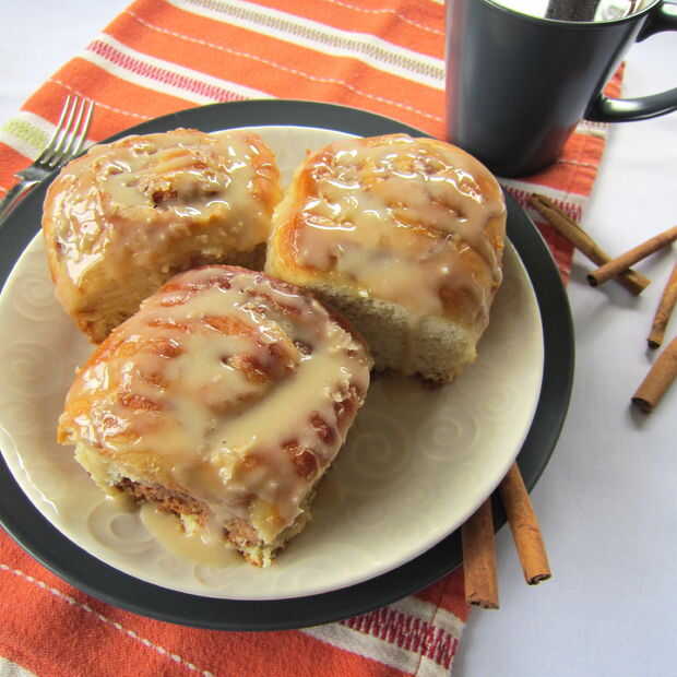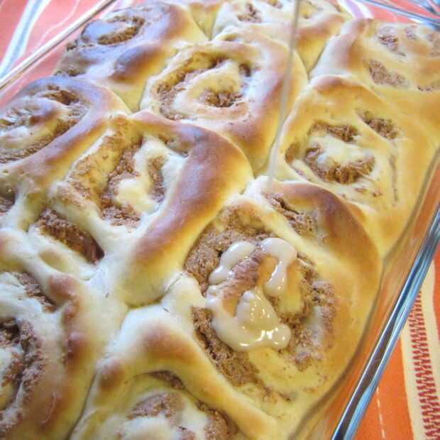 Salpicar el esmalte sobre rollos de canela calientes.
