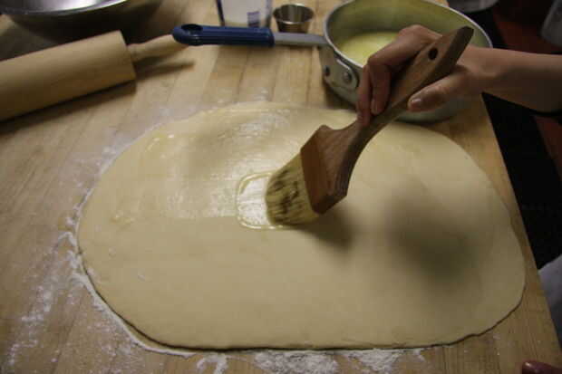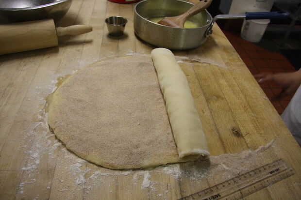 Cuando doble su tamaño, aplaste la masa. Estirar sobre una superficie enharinada en un rectángulo de 15 por 9 pulgadas. Unta de mantequilla derretida toda la masa. Mezclar azúcar y canela y espolvorear la masa con mantequilla. Espolvorear con las nueces, pecanas o pasas si se desea. Comenzando en el lado de 15 pulgadas, papel borde masa y pellizcar para sellar. Corte en rebanadas de 12 a 15.
