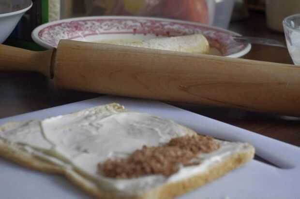 Rollo de la rebanada de pan, como un rollo de sushi. Asegúrese de que esté apretado.