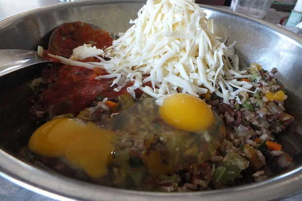 Añadir el arroz, verduras, 1 taza de salsa preparada, 2 lg huevos y 1 1/2 tazas mozzarella rallado, 1/2 cucharadita de cada de sal y pimienta si lo desea.