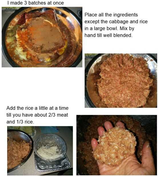 Añadir todos los ingredientes para el relleno, excepto la col y el arroz en un recipiente grande... Sus manos allí y los sucios. Este relleno debe estar bien mezclado. no queremos bolas de especias en el relleno nos sorprenderá en la cena. Asegúrese de que el relleno es homogéneo.