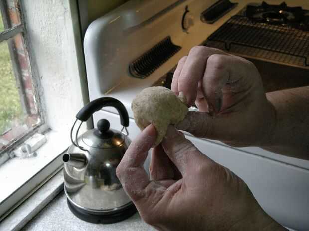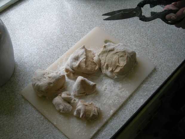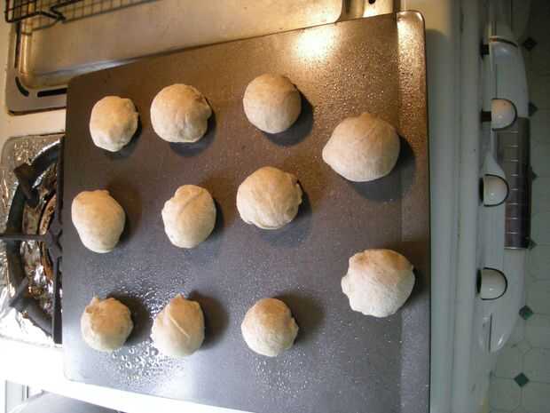 Cuando la masa haya terminado excepto el último levantamiento, retire de la máquina y cortar en cuartos. Entonces yo cortar los cuartos en tercios, esto hace 12 rollos. Puede hacerlos más pequeños o más grandes. A continuación rocíe la bandeja. Luego formar los rollos en bolas y ponerlas en la bandeja para hornear galletas. Hacer los rollos bien redonda tirando hacia abajo en los lados de la masa y elevando la parte inferior.