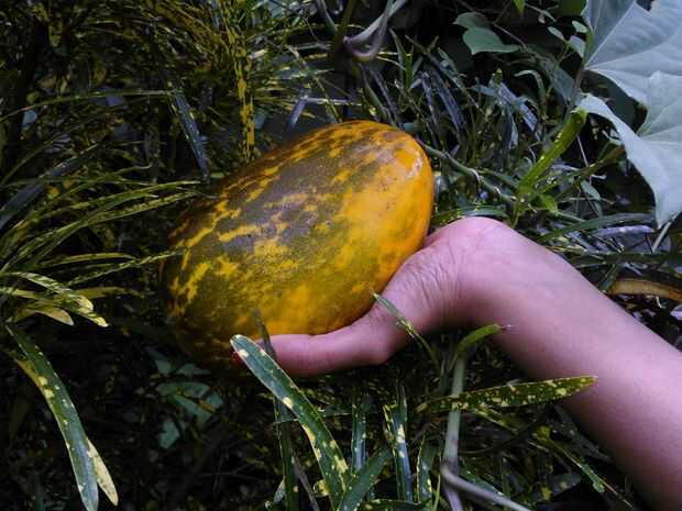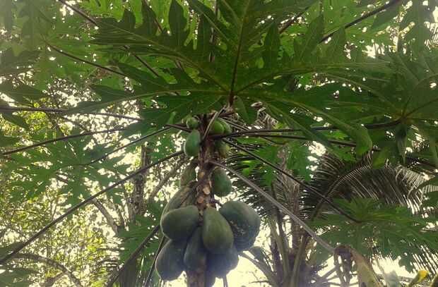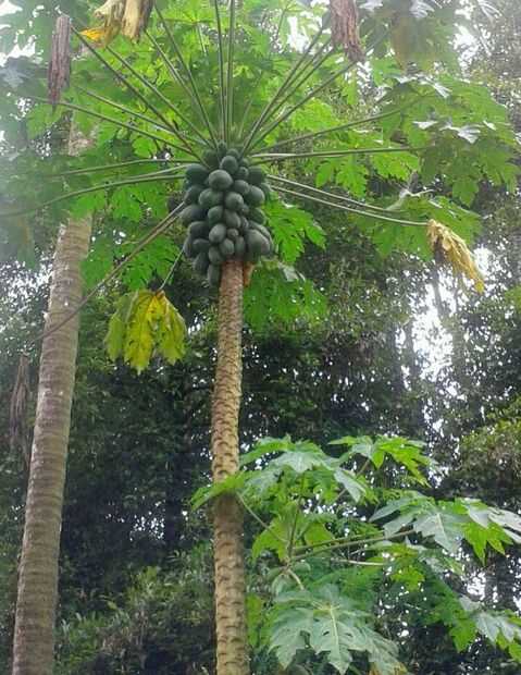 Papaya- La papaya de altura 10 m metros de altura es lo que encontré. Tenía una piel amarillo verdosa. Con ayuda de un gancho de madera ya nos tiró abajo los maduros. Los maduros tienen una piel amarillo anaranjado.