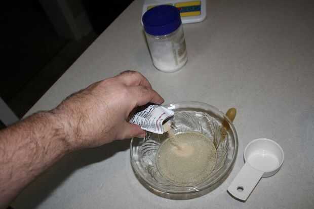 En un bol pequeño, disolver 1 cucharadita de azúcar en 1/4 taza de agua tibia (105º). La sección de ciencia de cocina a continuación a explicar por qué esta temperatura. Espolvorear la levadura sobre la superficie del agua y permite sentarse en un lugar cálido durante 5 minutos que es suficiente tiempo para hacer el siguiente paso.
