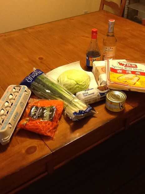 Necesita una libra de carne de cerdo. Puede dados algunos hasta pequeño real o conseguir cerdo de tierra. Se utilizó un paquete de salchicha suave. Ya es de tierra, tiene un sabor extra pequeño y es relativamente barato. También necesita una zanahoria (o una bolsa de zanahorias previamente ralladas), una de tamaño mediano col, una pequeña lata de brotes de bambú en rodajas, 2 huevos, 2 cebolletas, salsa de soja, vinagre de arroz (pero usted puede usar vinagre blanco normal si no tienes vinagre de arroz) y envolturas de rollo de huevo o envolturas de rollo de primavera. * Muchas recetas convocatoria de MSG a añadirse, pero no incluirlo porque algunas personas (como yo) puede hacer sentir mal. No dude en Añadir si lo desea.