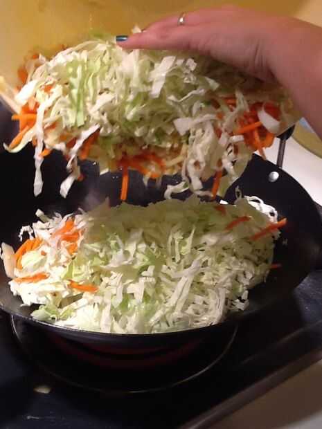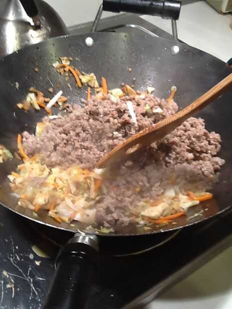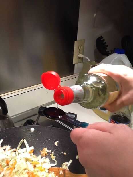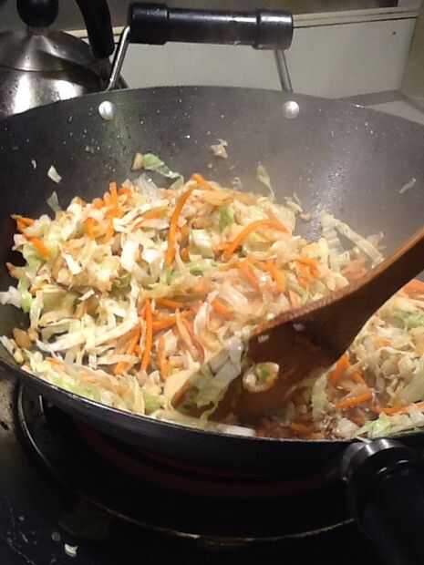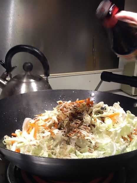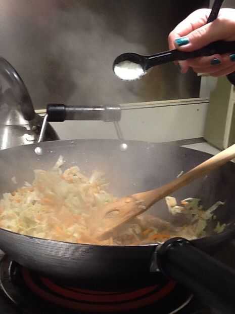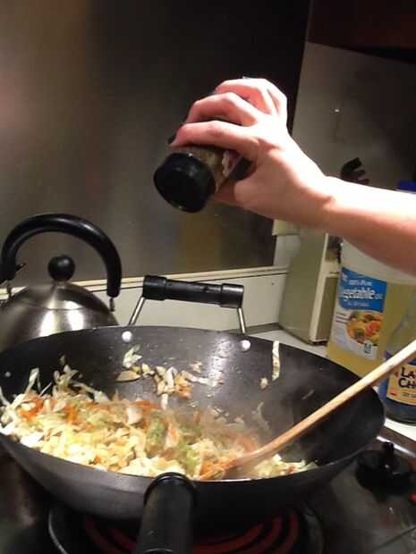 Dejar la carne de cerdo en el escurridor y limpie el wok, a menos que sea la suerte de tener más de uno. Vierta un poco de aceite en el fondo del wok y revolver en tus verduras. Añadir un par de cucharadas de salsa de soja, una cucharadita de vinagre de arroz, un par de rayitas de sal y pimienta y una cucharadita de azúcar. Saltear por unos 5 o 6 minutos, o hasta que las verduras comienza consiguiendo suave. Entonces tiro la carne de cerdo en y mezclarlo todo bien buena para un minuto.