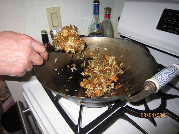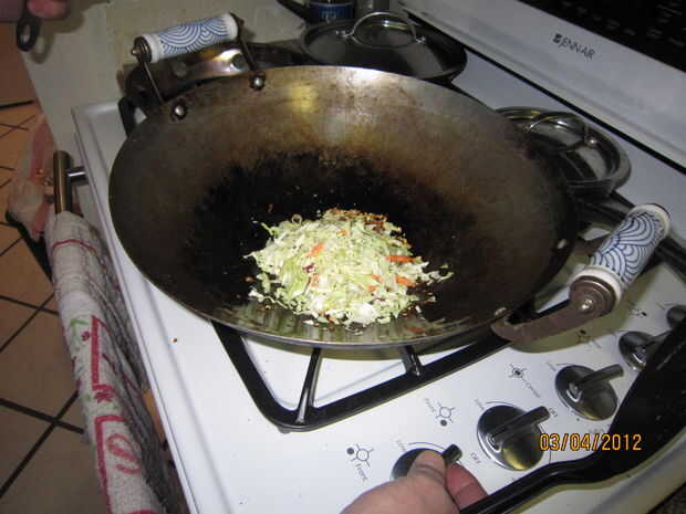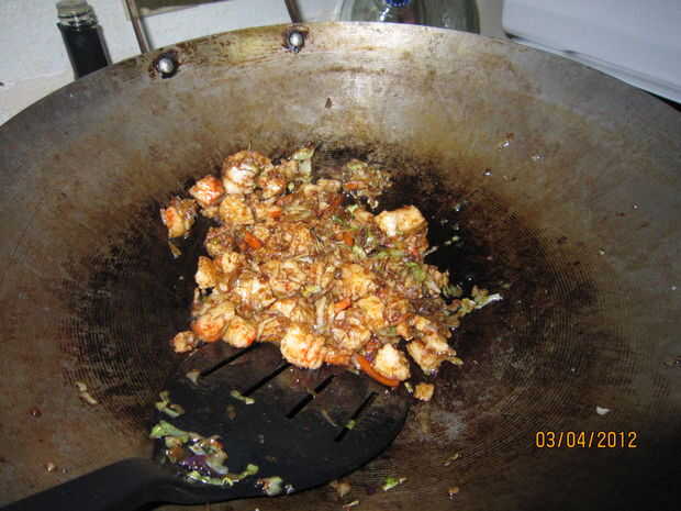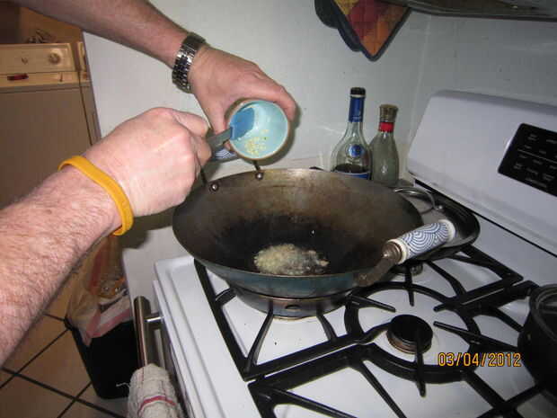 Puse un par de cucharadas de aceite en el wok y gire el calor a medio-alto. Deje que la temperatura de fritura del aceite alcance. Cerca de 350 grados es lo que buscas pero un viejo truco es regar un par de pequeñas gotas de agua en él. Si chisporrotea entonces su lo suficientemente caliente. Permítanme advertir aquí que significa pequeñas gotas y a espolvorear. Mojar tu dedo y sacudirla sobre el wok. Nunca vierta agua en el aceite caliente como sever quemaduras puede resultar.