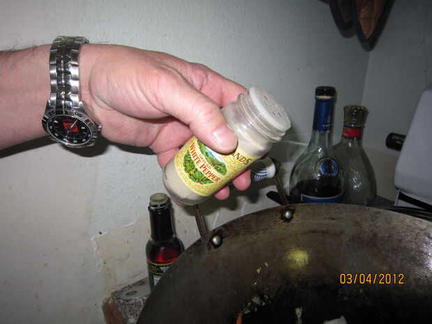 Añadir la pimienta blanca y salteado mezclar todo. Mantener a freír por un par de minutos para calentar a través de todo el camino.