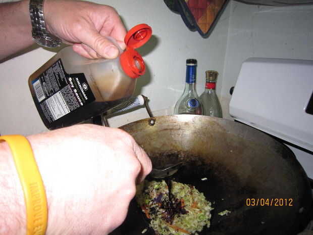 Añadir el aceite de sésamo, la salsa de soja y saltear por un minuto.