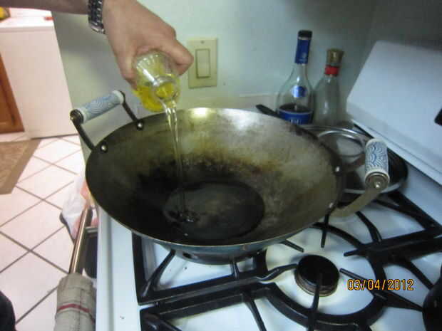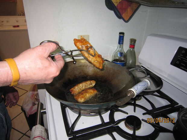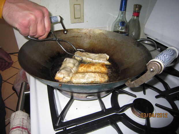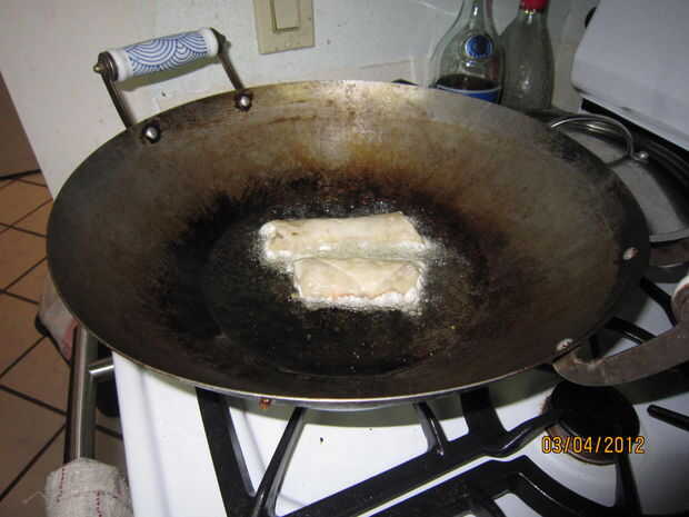 Cuando tengas todos tus rollos de huevo hechos poner suficiente aceite en la caminata para cubrir aproximadamente 3/4 de los rollos de huevo, tal vez una taza o una taza y media, dependiendo del tamaño de su bandeja.