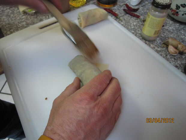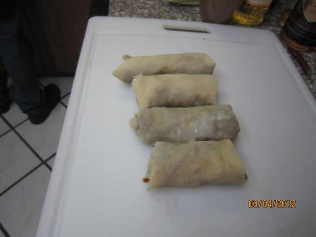 Generalmente me fríen cuatro rollos de huevo a la vez colocándolos en el aceite caliente con pinzas.