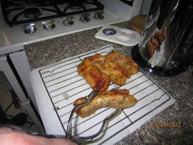 Retire los rollos del aceite y colocarlos sobre una rejilla con papel de cocina debajo de él para absorber las gotas.