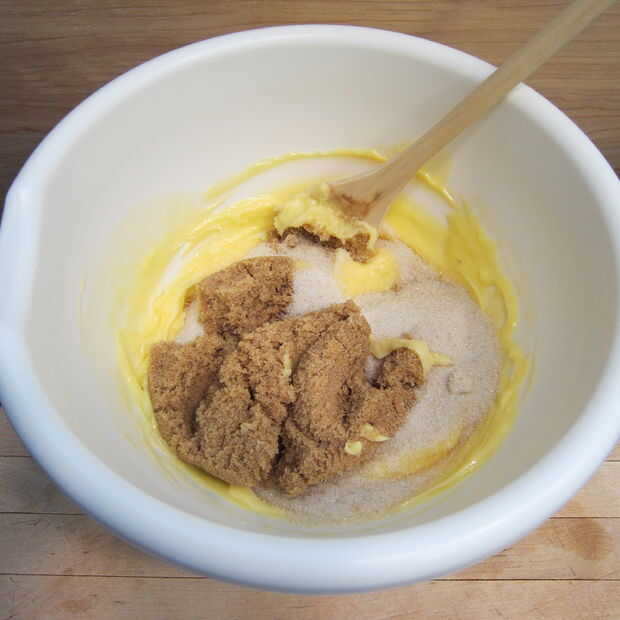 En una gran mezcla bowl crema mantequilla, azúcar y azúcar morena. Revuelva en vainilla y la leche.