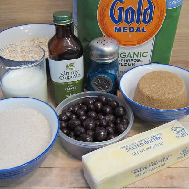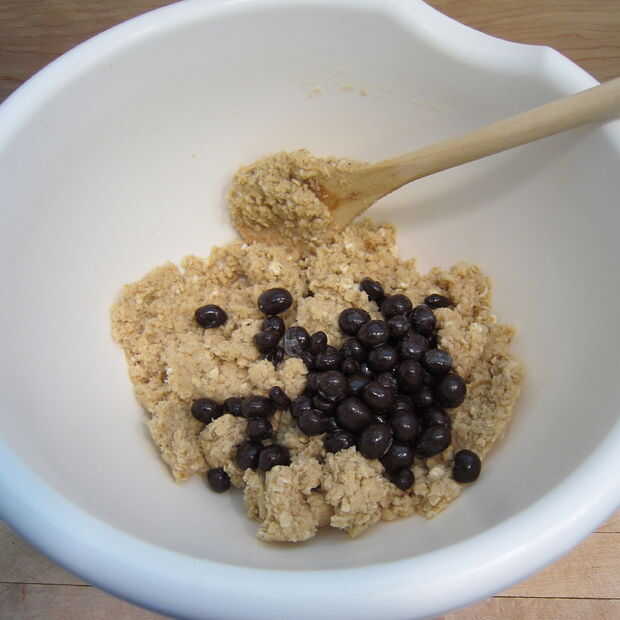 Coloque la sal y la harina, mezcle todo. Añadir la avena y revolver otra vez para incorporar. Añadir granos de café y mezclar bien.