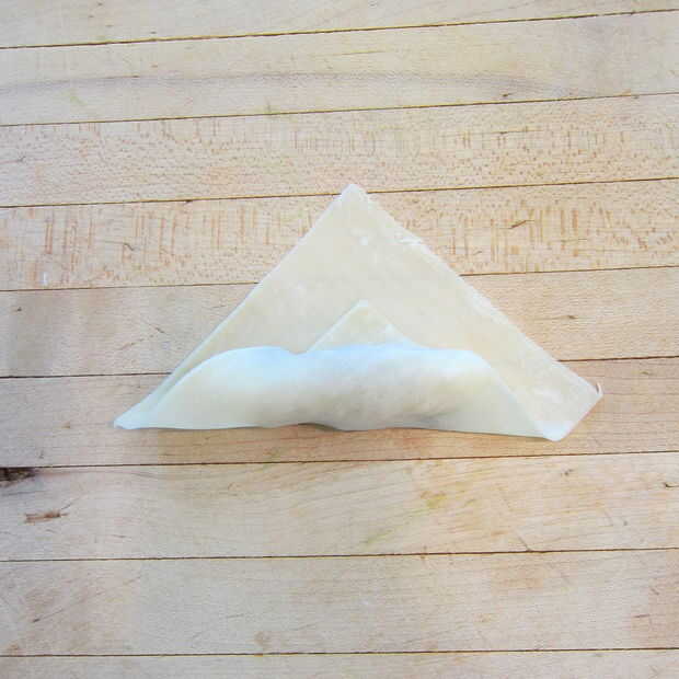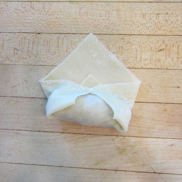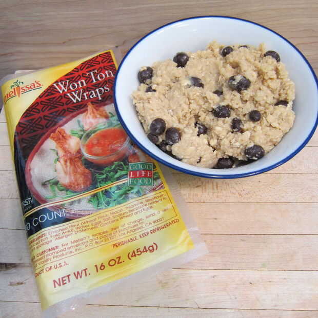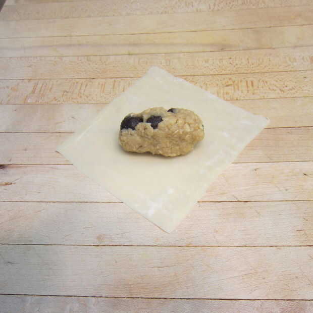 Colocar una envoltura de won ton en una superficie seca. Colocar aproximadamente 1 cucharada de pasta de la galleta en el centro del contenedor asegurándose de que hay dos o tres cubierto de granos de café en ella. Doble una esquina encima de la masa de galletas, luego doblar los lados. Usando su lenguado dedo algo de agua en el último rincón expuesto de la envoltura de won ton. Rodillo para fijar el contenedor cerrado.