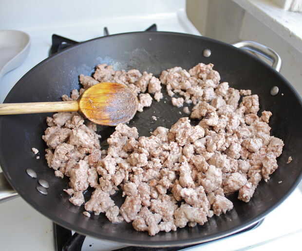 Calentar un poco de aceite en una sartén grande o wok sobre fuego medio y añadir en la libra de carne de cerdo de la tierra. Añadir una pizca de sal y pimienta y 1/2 cucharadita de polvo de la especia cinco chinos.
